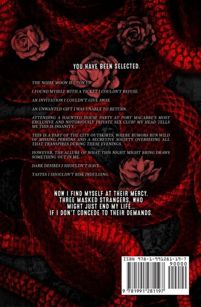 YOU HAVE BEEN SELECTED. The Noire Moon is upon us. I found myself with a ticket I couldn't refuse. An invitation I couldn't give away. An unwanted gift I was unable to return. Attending a haunted house party at Port Macabre's most exclusive and notoriously private sex club? My head tells me this is insanity. This is a part of the city outskirts, where rumors run wild of missing persons and a secretive society overseeing all that transpires during these evenings. However, the allure of what this night might bring draws something out in me. Dark desires I shouldn't have. Tastes I shouldn't risk indulging. Now I find myself at their mercy. Three masked strangers, who might just end my life... if I don't concede to their demands. NOTE: Noire Moon is a PROLOGUE NOVELLA and ends on a cliffhanger. It is a MMFM Why Choose/Reverse Harem Dark Secret Society Romance 18+ The Port Macabre world is full of ruthless, morally gray, poly love interests, and this novella introduces you to the main characters who will feature in the continuation of their story during MACABRE GODS. This book contains themes and scenarios common in dark romance. Please check the author's website for CWs.