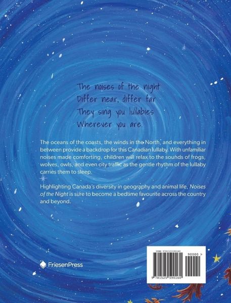 The noises of the night Differ near, differ far They sing you lullabies Wherever you are. The oceans of the coasts, the winds in the North, and everything in between provide a backdrop for this Canadian lullaby. With unfamiliar noises made comforting, children will relax to the sounds of frogs, wolves, owls, and even city traffic as the gentle rhythm of the lullaby carries them to sleep. Highlighting Canada's diversity in geography and animal life, Noises of the Night is sure to become a bedtime favourite across the country and beyond.
