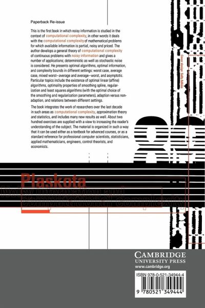 In this volume, which was originally published in 1996, noisy information is studied in the context of computational complexity; in other words the text deals with the computational complexity of mathematical problems for which information is partial, noisy and priced. The author develops a general theory of computational complexity of continuous problems with noisy information and gives a number of applications; deterministic as well as stochastic noise is considered. He presents optimal algorithms, optimal information, and complexity bounds in different settings: worst case, average case, mixed worst-average and average-worst, and asymptotic. The book integrates the work of researchers in such areas as computational complexity, approximation theory and statistics, and includes many fresh results as well. About two hundred exercises are supplied with a view to increasing the reader's understanding of the subject. The text will be of interest to professional computer scientists, statisticians, applied mathematicians, engineers, control theorists, and economists.