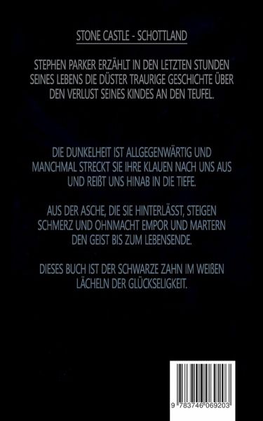 Die Dunkelheit ist allgegenwärtig und manchmal streckt sie ihre Klauen nach uns aus und reißt uns hinab in die Tiefe. Aus der Asche, die sie hinterlässt, steigen Schmerz und Ohnmacht empor und martern den Geist bis zum Lebensende. Wo Liebe gepflanzt wurde, ist Schmerz nicht weit. Je stärker die Liebe, desto größer der Schmerz. Dieses Buch ist der schwarze Zahn im weißen Lächeln der Glückseligkeit. Stone Castle - SchottlandDer 79-Jährige Stephen Parker erzählt in den letzten Stunden seines Lebens die düster traurige Geschichte über den Verlust seines Kindes an den Teufel.