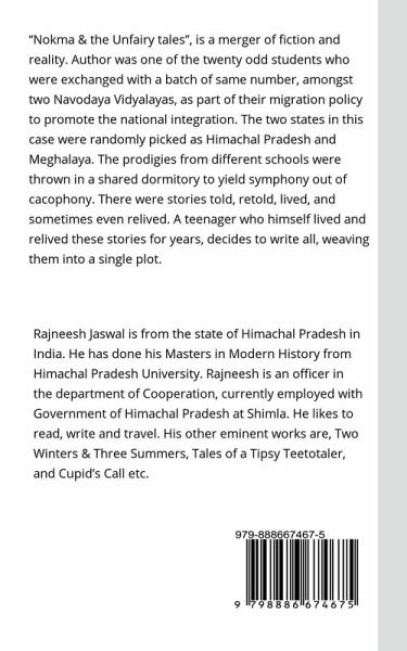 "Nokma & the Unfairy tales", is a merger of fiction and reality. Author was one of the twenty odd students who were exchanged with a batch of same number, amongst two Navodaya Vidyalayas, as part of their migration policy to promote the national integration. The two states in this case were randomly picked as Himachal Pradesh and Meghalaya. The prodigies from different schools were thrown in a shared dormitory to yield symphony out of cacophony. There were stories told, retold, lived, and sometimes even relived. A teenager who himself lived and relived these stories for years, decides to write all, weaving them into a single plot. Besides the storyline, it's an attempt to understand the typical North Eastern culture, the tribal livelihoods, the social usages in the light of matriarchy and matrilineal set up. The problems of tribal people in border areas, the cross border scuffles, the demographic disorders and the insurgency in North East, and the consequent shift in the mental psyche of the inhabitants.