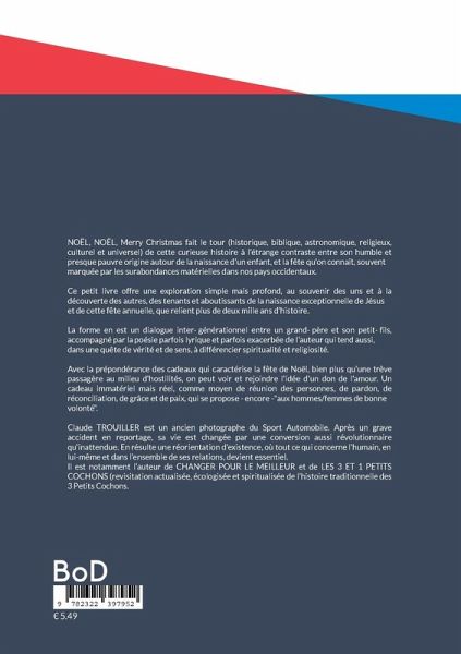 NOËL, NOËL, Merry Christmas fait le tour (historique, biblique, astronomique, religieux, culturel et universel) de cette curieuse histoire à l'étrange contraste entre son humble et presque pauvre origine autour de la naissance d'un enfant, et la fête qu'on connaît, souvent marquée par les surabondances matérielles dans nos pays occidentaux.Ce petit livre offre une exploration simple mais profond, au souvenir des uns et à la découverte des autres, des tenants et aboutissants de la naissance exceptionnelle de Jésus et de cette fête annuelle, que relient plus de deux mille ans d'histoire.La forme en est un dialogue inter-générationnel entre un grand-père et son petit-fils, accompagné par la poésie parfois lyrique et parfois exacerbée de l'auteur qui tend aussi, dans une quête de vérité et de sens, à différencier spiritualité et religiosité. Avec la prépondérance des cadeaux qui caractérise la fête de Noël, bien plus qu'une trêve passagère au milieu d'hostilités, on peut voir et rejoindre l'idée d'un don de l'amour. Un cadeau immatériel mais réel, comme moyen de réunion des personnes, de pardon, de réconciliation, de grâce et de paix, qui se propose - encore -"aux hommes/femmes de bonne volonté".