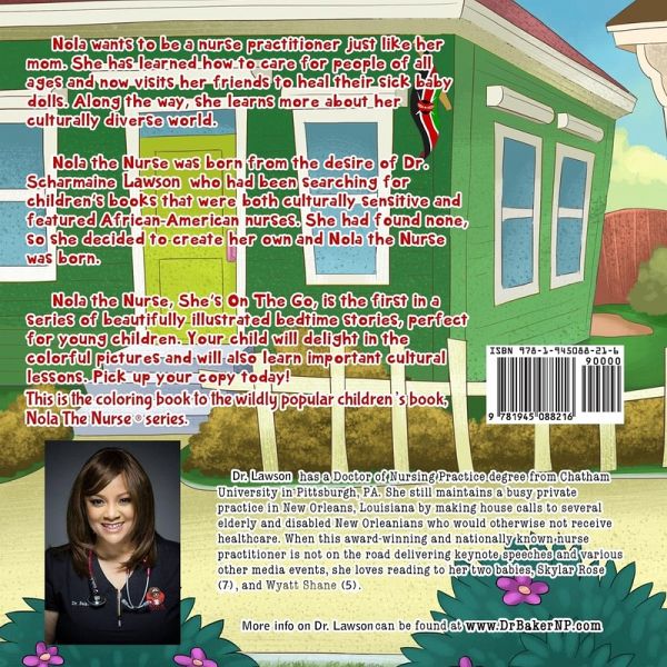 This is the coloring book to the wildly popular children's book series Nola The Nurse®: She's On The Go Vol. 1. Nola wants to be a nurse practitioner just like her mom. She has learned how to care for people of all ages and now visits her friends to heal their sick baby dolls. Along the way, she learns more about her culturally diverse world. Nola the Nurse was born from the desire of Dr. Scharmaine L. Baker, NP who had been searching for children's books that were both culturally sensitive and featured African-American nurses. She had found none, so she decided to create her own and Nola the Nurse was born. Nola the Nurse, She's On The Go, is the first in a series of beautifully illustrated bedtime stories, perfect for young children. Your child will delight in the colorful pictures and will also learn important cultural lessons. This is the companion coloring book to the Nola The Nurse® She's On The Go series, vol. 1. It is a true coloring book. There are no words.