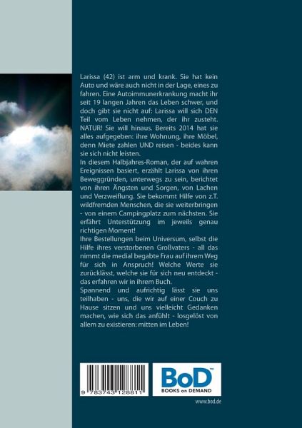 Larissa (42) ist arm und krank. Sie hat kein Auto und wäre auch nicht in der Lage, Eines zu fahren. Eine Autoimmunerkrankung macht ihr seit 19 langen Jahren das Leben schwer, und doch gibt sie nicht auf: Larissa will sich DEN Teil vom Leben nehmen, der ihr zusteht. NATUR! Sie will hinaus. Bereits 2014 hat sie alles aufgegeben: ihre Wohnung, ihre Möbel, denn Miete zahlen UND reisen - Beides kann sie sich nicht leisten. In diesem Halbjahres-Roman, der auf wahren Ereignissen basiert, erzählt Larissa von ihren Beweggründen, unterwegs zu sein, berichtet von ihren Ängsten und Sorgen, von Lachen und Verzweiflung. Sie bekommt Hilfe von z.T. wildfremden Menschen, die sie weiterbringen - von einem Campingplatz zum nächsten. Sie erfährt Unterstützung im jeweils genau richtigen Moment! Ihre Bestellungen beim Universum, selbst die Hilfe ihres verstorbenen Großvaters - all das nimmt die medial begabte Frau auf ihrem Weg für sich in Anspruch! Welche Werte sie zurücklässt, welche sie für sich neu entdeckt - das erfahren wir in ihrem Buch. Spannend und aufrichtig lässt sie uns teilhaben - uns, die wir auf einer Couch zu Hause sitzen und uns vielleicht Gedanken machen, wie sich das anfühlt - losgelöst von Allem zu existieren: mitten im Leben!