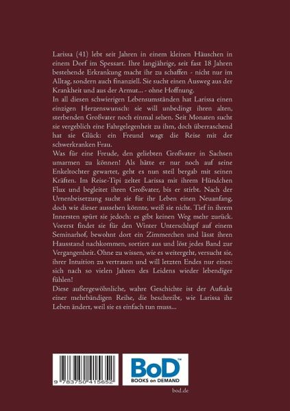 Larissa (41) lebt seit Jahren in einem kleinen Häuschen in einem Dorf im Spessart. Ihre langjährige, seit fast 18 Jahren bestehende Erkrankung macht ihr zu schaffen - nicht nur im Alltag, sondern auch finanziell. Sie sucht einen Ausweg aus der Krankheit und aus der Armut... ohne Hoffnung.In all diesen schwierigen Lebensumständen hat Larissa einen einzigen Herzenswunsch: sie will unbedingt ihren alten, sterbenden Großvater noch einmal sehen. Seit Monaten sucht sie vergeblich eine Fahrgelegenheit zu ihm, doch überraschend hat sie Glück: ein Freund wagt die Reise mit der schwerkranken Frau.Was für eine Freude, den geliebten Großvater in Sachsen umarmen zu können! Als hätte er nur noch auf seine Enkeltochter gewartet, geht es nun steil bergab mit seinen Kräften. Im Reise-Tipi zeltet Larissa mit ihrem Hündchen Flux und begleitet ihren Großvater, bis er stirbt. Nach der Urnenbeisetzung sucht sie für ihr Leben einen Neuanfang, doch wie dieser aussehen könnte, weiß sie nicht. Tief in ihrem Innersten spürt sie jedoch: es gibt keinen Weg mehr zurück. Vorerst findet sie für den Winter Unterschlupf auf einem Seminarhof, bewohnt dort ein Zimmerchen und lässt ihren Hausstand nachkommen, sortiert aus und löst jedes Band zur Vergangenheit. Ohne zu wissen, wie es weitergeht, versucht sie, ihrer Intuition zu vertrauen und will letzten Endes nur eines: sich nach so vielen Jahren des Leidens wieder lebendiger fühlen!Diese außergewöhnliche, wahre Geschichte ist der Auftakt einer mehrbändigen Reihe, die beschreibt, wie Larissa ihr Leben ändert, weil sie es einfach tun muss...