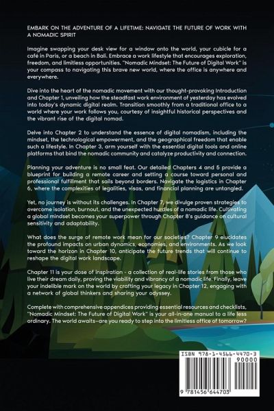 Embark on the Adventure of A Lifetime: Navigate the Future of Work with a Nomadic Spirit Imagine swapping your desk view for a window onto the world, your cubicle for a café in Paris, or a beach in Bali. Embrace a work lifestyle that encourages exploration, freedom, and limitless opportunities. "Nomadic Mindset: The Future of Digital Work" is your compass to navigating this brave new world, where the office is anywhere and everywhere. Dive into the heart of the nomadic movement with our thought-provoking Introduction and Chapter 1, unveiling how the steadfast work environment of yesterday has evolved into today's dynamic digital realm. Transition smoothly from a traditional office to a world where your work follows you, courtesy of insightful historical perspectives and the vibrant rise of the digital nomad. Delve into Chapter 2 to understand the essence of digital nomadism, including the mindset, the technological empowerment, and the geographical freedom that enable such a lifestyle. In Chapter 3, arm yourself with the essential digital tools and online platforms that bind the nomadic community and catalyze productivity and connection. Planning your adventure is no small feat. Our detailed Chapters 4 and 5 provide a blueprint for building a remote career and setting a course toward personal and professional fulfillment that sails beyond borders. Navigate the logistics in Chapter 6, where the complexities of legalities, visas, and financial planning are untangled. Yet, no journey is without its challenges. In Chapter 7, we divulge proven strategies to overcome isolation, burnout, and the unexpected hurdles of a nomadic life. Cultivating a global mindset becomes your superpower through Chapter 8's guidance on cultural sensitivity and adaptability. What does the surge of remote work mean for our societies? Chapter 9 elucidates the profound impacts on urban dynamics, economies, and environments. As we look toward the horizon in Chapter 10, anticipate the future trends that will continue to reshape the digital work landscape. Chapter 11 is your dose of inspiration - a collection of real-life stories from those who live their dream daily, proving the viability and vibrancy of a nomadic life. Finally, leave your indelible mark on the world by crafting your legacy in Chapter 12, engaging with a network of global thinkers and sharing your odyssey. Complete with comprehensive appendices providing essential resources and checklists, "Nomadic Mindset: The Future of Digital Work" is your all-in-one manual to a life less ordinary. The world awaits-are you ready to step into the limitless office of tomorrow?