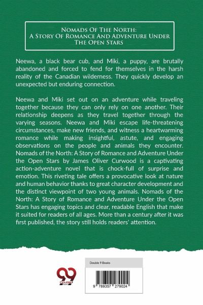 Neewa, a black bear cub, and Miki, a puppy, are brutally abandoned and forced to fend for themselves in the harsh reality of the Canadian wilderness. They quickly develop an unexpected but enduring connection. Neewa and Miki set out on an adventure while traveling together because they can only rely on one another. Their relationship deepens as they travel together through the varying seasons. Neewa and Miki escape life-threatening circumstances, make new friends, and witness a heartwarming romance while making insightful, astute, and engaging observations on the people and animals they encounter. Nomads of the North: A Story of Romance and Adventure Under the Open Stars by James Oliver Curwood is a captivating action-adventure novel that is chock-full of surprise and emotion. This riveting tale offers a provocative look at nature and human behavior thanks to great character development and the distinct viewpoint of two young animals. Nomads of the North: A Story of Romance and Adventure Under the Open Stars has engaging topics and clear, readable English that make it suited for readers of all ages. More than a century after it was first published, the story still holds readers' attention.
