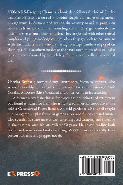 NOMADS-Escaping Chaos is a book that follows the life of Shirley and Sam Simmons a retired Snowbird couple that make extra money buying items in Arizona and around the country to sell to people on homesteads in Idaho and surrounding states. They get embroiled in local issues in a small town in Idaho. They are joined with other retired couples and young working couples when they go back to Arizona to settle their affairs there who are fleeing to escape conflicts imposed on them by a fluid southern border to the small town in the state of Idaho only to be confronted by a much larger and more deadly international foe.