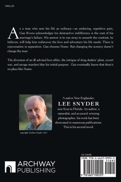 As a man who sees his life as ordinary-an enduring, repetitive pain, Gus Rivers acknowledges his destructive indifference is the root of his marriage's failure. His answer is to run away to unearth the contrast, he believes, will help him rediscover the love and adventure his life needs. There is rejuvenation in separation. Gus chooses Nome. But changing the scenery doesn't change the man. The diversion of an ill-advised love affair, the intrigue of drug dealers' plots, covert war, and savage murders blur his initial purpose. Gus eventually learns that there's no place like Nome.