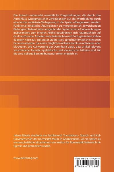 Die Autorin untersucht wesentliche Fragestellungen, die durch den Ausschluss syntagmatischer Verbindungen aus der Wortbildung durch eine formal motivierte Verlagerung in die Syntax offengelassen werden. Funktional-inhaltliche Äquivalenzen zu morphologisch abweichenden Bildungen blieben bisher ausgeblendet. Systematische Untersuchungen insbesondere zum inneren Artikel beschränken sich hauptsächlich auf das Französische, Arbeiten zum Italienischen und Portugiesischen stehen dagegen noch aus. Ziel dieser Studie ist es, sprachsystematische Kriterien herauszuarbeiten, die einen möglichen Artikelanschluss motivieren oder blockieren. Die Auswertung der Datenbasis zeigt, dass artikel-relevant verschiedene, formale, syntaktische und semantische Kriterien sind, für die eine isolierte Beschreibung nur selten möglich ist.
