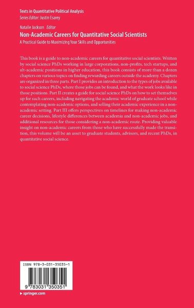 This book is a guide to non-academic careers for quantitative social scientists. Written by social science PhDs working in large corporations, non-profits, tech startups, and alt-academic positions in higher education, this book consists of more than a dozen chapters on various topics on finding rewarding careers outside the academy. Chapters are organized in three parts. Part I provides an introduction to the types of jobs available to social science PhDs, where those jobs can be found, and what the work looks like in those positions. Part II creates a guide for social science PhDs on how to set themselves up for such careers, including navigating the academic world of graduate school while contemplating non-academic options, and selling their academic experience in a non-academic setting. Part III offers perspectives on timelines for making non-academic career decisions, lifestyle differences between academia and non-academic jobs, and additional resources for those consideringa non-academic route. Providing valuable insight on non-academic careers from those who have successfully made the transition, this volume will be an asset to graduate students, advisors, and recent PhDs, in quantitative social science.