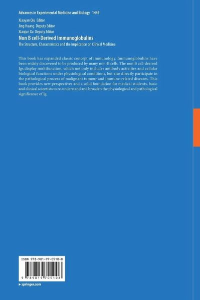 Chapter 1 The history of appreciation of immunoglobulin and the discovery of non-B cell derived immunoglobulins.- Chapter 2 Expression profile of non B-Ig in different lineage cells.- Chapter 3 Unique V(D)J recombination characteristics and repertoire of non B-Ig.- Chapter 4 Unique regulation mechanismof non B-Ig gene.- Chapter 5 Unique structure and function of non B-Ig.- Chapter 6 Comparison of non B-Ig and B-Ig.- Chapter 7 Functionsand clinical relevanceof non-B cell derived immunoglobulin in liver.- Chapter 8 Significance of non-Bcell derived immunoglobulins in renal disease.- Chapter 9 Functions and clinical significance of myocardial cell-derived Immunoglobulins.- Chapter 10 Biological functions and clinical significance of intestinal non B-Immunoglobulins.- Chapter 11 Function of IgG and IgA in normal human skin.- Chapter 12 Significance of cancer-derived IgG in lung cancer.- Chapter 13 Significance of cancer-derived IgG in breast cancer.- Chapter 14 Significance of cancer-derived IgG in pancreatic cancer.- Chapter 15 Biological functions and clinical significance of non B-Ig in hemopoietic system.