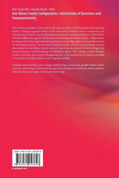This volume provides a close look at the ways in which LGBTQ2 people form familial bonds. It brings together stories from non-binary families across continents and cultures and recenters care as a foundational value for creating familial ties. This volume therefore addresses a gap in the literature concerning non-binary family configurations by going beyond the legal battle for non-binary partnership rights. In recent discussions on marriage equality, the notion of familial bonds, which was important in early discussions on non-binary family research, has been decentered in favor of legal and homonormative understandings of individual rights. This volume centers familial bonds as the first step toward reimagining how to do research on the family and adds to research on family studies as well as gender studies.