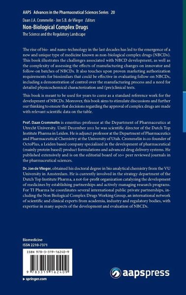 The rise of bio- and nano-technology in the last decades has led to the emergence of a new and unique type of medicine known as non-biological complex drugs (NBCDs). This book illustrates the challenges associated with NBCD development, as well as the complexity of assessing the effects of manufacturing changes on innovator and follow-on batches of NBCDs. It also touches upon proven marketing authorization requirements for biosimilars that could be effective in evaluating follow-on NBCDs, including a demonstration of control over the manufacturing process and a need for detailed physico-chemical characterization and (pre)clinical tests.