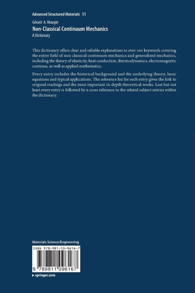 This dictionary offers clear and reliable explanations of over 100 keywords covering the entire field of non-classical continuum mechanics and generalized mechanics, including the theory of elasticity, heat conduction, thermodynamic and electromagnetic continua, as well as applied mathematics.