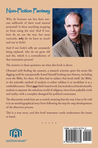 Non-Fiction Fantasy Why do humans use less than one-one millionth of their total mental potential? Is there anything stopping us from using the rest? And if not, how do we use the rest, but most curiously, why do we have so much and use so little? And if our body's cells are constantly being replaced, why do we grow old and die, which is a contradiction of that restoration process? The answers to these questions are what this book is about. Obsessed with finding the answers, a research scientist spent his entire life digging until he unexpectedly found himself looking into history, including even the Bible, for clues. He then had to subject that book itself, the Bible, to the scientific method of analysis to either validate it or invalidate it as a creditable source. This is not a faith-based work, but includes a clinical scientific analysis to separate the nebulous world of religious views from palpable truth and reality, with a complete disregard for political correctness. The discoveries made here are so utterly amazing that the way it has to be told is in an autobiographical story form following the step-by-step developments of the discovery process. This is a true story, and this brief statement vastly understates the issues at hand. * * * * *