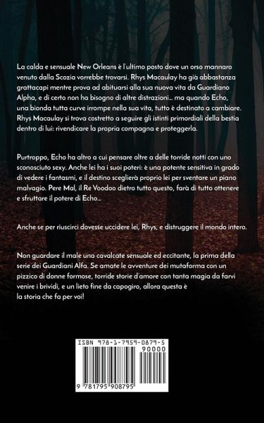 La calda e sensuale New Orleans è l'ultimo posto dove un orso mannaro venuto dalla Scozia vorrebbe trovarsi. Rhys Macaulay ha già abbastanza grattacapi mentre prova ad abituarsi alla sua nuova vita da Guardiano Alpha, e di certo non ha bisogno di altre distrazioni... ma quando Echo, una bionda tutta curve irrompe nella sua vita, tutto è destinato a cambiare. Rhys Macaulay si trova costretto a seguire gli istinti primordiali della bestia dentro di lui: rivendicare la propria compagna e proteggerla. Purtroppo, Echo ha altro a cui pensare oltre a delle torride notti con uno sconosciuto sexy. Anche lei ha i suoi poteri: è una potente sensitiva in grado di vedere i fantasmi, e il destino sceglierà proprio lei per sventare un piano malvagio. Pere Mal, il Re Voodoo dietro tutto questo, farà di tutto ottenere e sfruttare il potere di Echo... Anche se per riuscirci dovesse uccidere lei, Rhys, e distruggere il mondo intero. Non guardare il male una cavalcate sensuale ed eccitante, la prima della serie dei Guardiani Alfa. Se amate le avventure dei mutaforma con un pizzico di donne formose, torride storie d'amore con tanta magia da farvi venire i brividi, e un lieto fine da capogiro, allora questa è la storia che fa per voi!