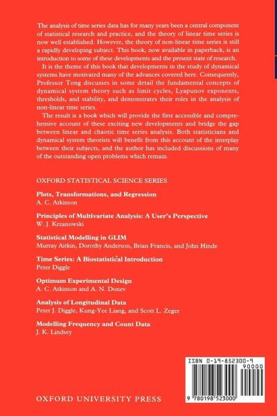 The analysis of time series data has for many years been a central component of statistical research and practice. Although the theory of linear time series is now well established, that of non-linear time series is still a rapidly developing subject. This book, now available in paperback, is an introduction to some of these developments and the present state of research.