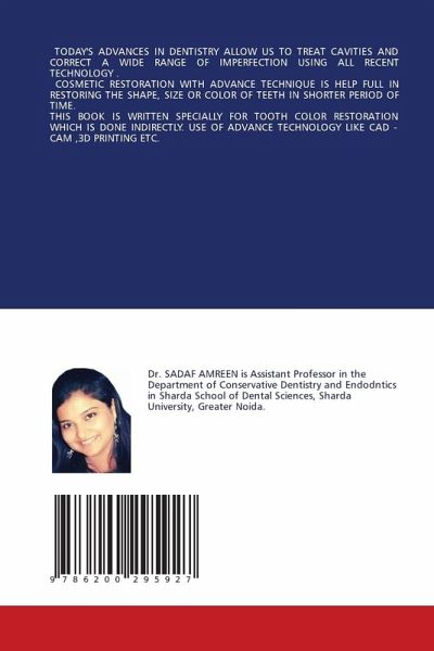 TODAY'S ADVANCES IN DENTISTRY ALLOW US TO TREAT CAVITIES AND CORRECT A WIDE RANGE OF IMPERFECTION USING ALL RECENT TECHNOLOGY . COSMETIC RESTORATION WITH ADVANCE TECHNIQUE IS HELP FULL IN RESTORING THE SHAPE, SIZE OR COLOR OF TEETH IN SHORTER PERIOD OF TIME. THIS BOOK IS WRITTEN SPECIALLY FOR TOOTH COLOR RESTORATION WHICH IS DONE INDIRECTLY. USE OF ADVANCE TECHNOLOGY LIKE CAD -CAM ,3D PRINTING ETC.