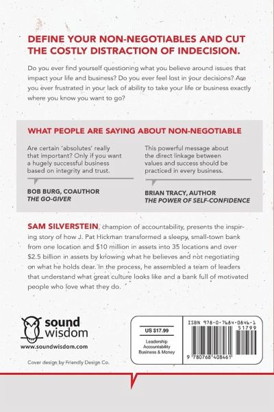 Do you ever find yourself questioning what you believe around issues that impact your life and business? Do you ever feel lost in your decisions? Are you ever frustrated in your lack of ability to take your life or business exactly where you know you want to go? Non-Negotiable is all about understanding what you believe, what you can control, what your mission is and ultimately taking your convictions to the level of Non-Negotiable. Based on the real life story of J. Pat Hickman, a man with a purpose, and the bank he leads, Happy State Bank, you will see firsthand what success looks like. Sam Silverstein, champion of accountability, presents the inspiring story of how J. Pat Hickman transformed a sleepy small town bank from one location and $10 million in assets into 34 locations and over $2.5 billion in assets by knowing what he believes and not negotiating on what he holds dear. In the process, he assembled a team of leaders that understand what great culture looks like and a bank full of motivated people who love what they do. Read this book to: * Discover and define your own Non-Negotiables * Energize your ability to avoid distractions and make important decisions * Establish a culture that promotes personal and organizational accountability * Understand the power of true accountability * Unleash the power of knowing what it is you truly believe