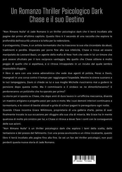"Non Rimane Nulla" di Jade Romano è un thriller psicologico dark che ti terrà incollato alle pagine dal primo all'ultimo capitolo. Questo libro è il secondo di una raccolta che esplora le profondità dell'oscurità umana e la lotta per la redenzione.Il protagonista, Chase, è un artista tormentato che ha trascorso la sua vita circondato da abusi, tradimenti e perdite. Disperato per porre fine alla sua infelicità, Chase si trova ad essere manipolato da Leonard Bazzi, un agente della mafia di New York che vede in lui un timore che può essere sfruttato per il loro reciproco vantaggio. Ma quello che Chase ottiene è molto peggio di quello che si aspettava, e si ritrova intrappolato in un incubo dal quale sembra impossibile sfuggire.Il libro si apre con una scena adrenalinica che vede due agenti di polizia, Perez e Davis, impegnati in una corsa contro il tempo per raggiungere l'ospedale. Mentre le sirene suonano e le luci lampeggiano, Davis si chiede se lui e sua moglie Michelle riusciranno mai a godersi la pensione dopo questa notte. Ma il commissario o il sindaco se ne dimenticheranno? E perdoneranno un poliziotto che ha sparato per primo?La storia poi si sposta su Chase, che dopo anni di duro lavoro in un'officina meccanica, diventa un maestro artigiano e progetta pezzi per auto e moto. Ma i suoi demoni interiori continuano a tormentarlo, e le visioni di bestie abissali e grida di schiavi pagani lo perseguitano ogni notte.Quando Chase incontra Grace Whitmore, proprietaria di una galleria d'arte, pensa di aver finalmente trovato la sua occasione per sfuggire alla sua vita di miseria. Ma Grace ha in mente qualcosa di molto più sinistro per lui, e Chase si ritrova a dover fare i conti con le conseguenze delle sue azioni."Non Rimane Nulla" è un thriller psicologico dark che esplora i temi della scelta, della tentazione e del prezzo del fallimento. Con una prosa avvincente e un ritmo incalzante, questo libro ti terrà incollato alle pagine fino alla fine. Se sei un fan dei thriller psicologici, non puoi perderti questa nuova storia di Jade Romano.