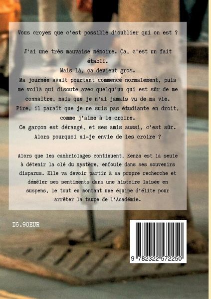 Vous croyez que c'est possible d'oublier qui on est ? J'ai une très mauvaise mémoire. Ça, c'est un fait établi. Mais là, ça devient gros. Ma journée avait pourtant commencé normalement, puis me voilà qui discute avec quelqu'un qui est sûr de me connaître, mais que je n'ai jamais vu de ma vie. Pire, il paraît que je ne suis pas étudiante en droit, comme j'aime à le croire. Ce garçon est dérangé, et ses amis aussi, c'est sûr. Alors pourquoi ai-je envie de les croire ? Alors que les cambriolages continuent, Kenza est la seule à détenir la clé du mystère, enfouie dans ses souvenirs disparus. Elle va devoir partir à sa propre recherche et démêler ses sentiments dans une histoire laisée en suspens, le tout en montant une équipe d'élite pour arrêter la taupe de l'Académie.