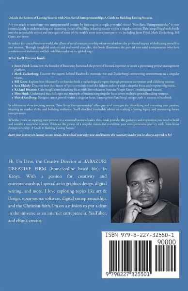 Unlock the Secrets of Lasting Success with Non-Serial Entrepreneurship: A Guide to Building Lasting Success. Are you ready to transform your entrepreneurial journey by focusing on a single, powerful vision? "Non-Serial Entrepreneurship" is your essential guide to understanding and mastering the art of building enduring success within a singular venture. This compelling ebook dwells into the remarkable stories and strategies of some of the world's most iconic entrepreneurs, including Jason Fried, Mark Zuckerberg, Bill Gates, and more. In today's fast-paced business world, the allure of serial entrepreneurship often overshadows the profound impact of dedicating oneself to one mission. Through insightful analysis and real-world examples, this book illuminates the path of non-serial entrepreneurs who have revolutionized industries and left indelible marks on the global stage. What You'll Discover Inside:Jason Fried: Learn how the founder of Basecamp harnessed the power of focused expertise to create a pioneering project management platform. Mark Zuckerberg: Uncover the secrets behind Facebook's meteoric rise and Zuckerberg's unwavering commitment to a singular vision. Bill Gates: Explore how Microsoft's co-founder built a technological empire through persistent innovation and a lifelong mission. Sara Blakely: Discover how the creator of Spanx revolutionized the fashion industry with a singular focus and empowering vision. Richard Branson: Gain insights into balancing focus with diversification from the Virgin Group's multifaceted success. Elon Musk: Understand the challenges and triumphs of maintaining singular focus across multiple groundbreaking ventures. Sheryl Sandberg: Navigate career growth within a singular focus, learning from Sandberg's unique path to success at Facebook. In addition to these inspiring stories, "Non-Serial Entrepreneurship" offers practical strategies for identifying and nurturing your passion, adapting to market shifts, and building resilience. You'll also find invaluable advice on crafting a lasting legacy and mentoring future entrepreneurs. Whether you're an aspiring entrepreneur or a seasoned business leader, this ebook provides the guidance and inspiration you need to build and sustain a successful venture. Embrace the power of a singular vision and transform your entrepreneurial journey with "Non-Serial Entrepreneurship: A Guide to Building Lasting Success." Start your journey to lasting success today. Download your copy now and become the visionary leader you've always aspired to be!