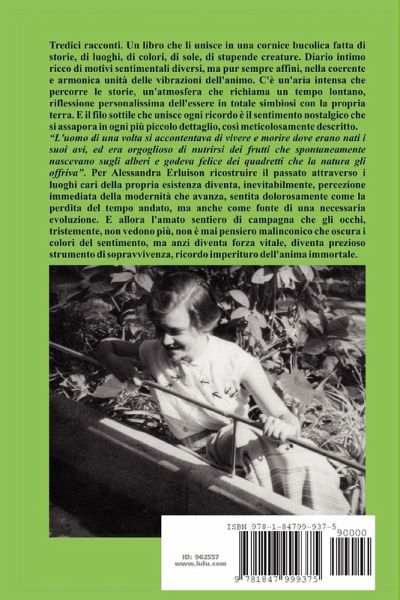 Tredici racconti. Un libro che li unisce in una cornice bucolica fatta di storie, di luoghi, di colori, di sole, di stupende creature. Diario intimo ricco di motivi sentimentali diversi, ma pur sempre affini, nella coerente e armonica unità delle vibrazioni dell'animo. C'è un'aria intensa che percorre le storie, un'atmosfera che richiama un tempo lontano, riflessione personalissima dell'essere in totale simbiosi con la propria terra. E il filo sottile che unisce ogni ricordo è il sentimento nostalgico che si assapora in ogni più piccolo dettaglio, così meticolosamente descritto. L'amato sentiero di campagna non è mai pensiero malinconico che oscura i colori del sentimento, ma anzi diventa forza vitale, diventa prezioso strumento di sopravvivenza, ricordo imperituro dell'anima immortale.