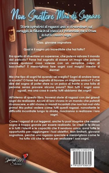 Ciao piccolo sognatore! Qual è il sogno più incredibile che hai fatto? Era quello di diventare un supereroe, che poteva salvare il mondo dal pericolo? Forse hai sognato di essere un mago che poteva creare qualsiasi cosa volesse con un semplice colpo di bacchetta? È meraviglioso fare sogni così magici mentre si dorme! Ma che tipo di sogni fai quando sei sveglio? Sogni di andare bene a scuola? O forse hai sognato di trovare un migliore amico? Che ne dici di sognare di poter stare su un palco di fronte a una folla di persone senza provare alcuna paura? Non tutti i sogni sono uguali, ma una cosa è certa: tutti abbiamo dei sogni! In questo libro troverete storie di ragazzi e che hanno seguito e realizzato i loro sogni. Alcuni di loro vivono in un mondo che potresti riconoscere, e alcuni di loro in mondi incantati che non hai mai visto prima! Ma potrai vedere come tutti questi ragazzi, nonostante tutte le difficoltà incontrate lungo la strada, hanno creduto in sé stessi e nelle proprie capacità e sono riusciti a realizzare i loro sogni. Come i ragazzi di cui leggerete, anche tu potrai scoprire che nessun sogno è troppo grande per essere realizzato. Se credi in te stesso e in tutti i talenti e le capacità che ti rendono unico, avrai tutte le opportunità per raggiungere i tuoi obiettivi. Non limitarti, piccolo sognatore, perché un ragazzo speciale e meraviglioso come te ha tutto ciò che gli serve per realizzare i suoi sogni. Cosa troverai in questo libro: 10 Storie ispiratrici per ragazzi sull' autostima, il coraggio, la forza interiore e l'amor proprio. Uno stile di scrittura semplice ed accattivante adatto sia alla lettura condivisa che a quella indipendente Identificazione con i personaggi, che anche se immaginari, sono sempre combinati con temi della vita reale dei bambini Belle Immagini per accompagnare la lettura e stimolare l'immaginazione Morali e Messaggi di Vita con riflessioni e coinvolgimenti nella narrazione I ragazzi amano questo libro perché li aiuta a: Credere nei propri sogni Sviluppare la fiducia in sé stessi e nelle proprie capacità Affrontare meglio le situazioni difficili Superare le paure ed essere coraggiosi Capire l'importanza dei rapporti con genitori e amici 2 Regali per te che puoi scaricare dal sito di Special Art: Diario dei sogni per bambini (PDF) Frasi motivazionali libro da colorare per bambini (PDF) Clicca su ""compra ora"" e aiuta un ragazzo a non smettere mai di sognare e a credere in se stesso! (Una Perfetta Idea Regalo)