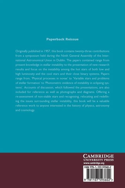 Originally published in 1957, this book contains twenty-three contributions from a symposium held during the Ninth General Assembly of the International Astronomical Union in Dublin. The papers contained range from present knowledge in stellar instability to the presentation of new research results and focus on the instability among the hot stars of both low and high luminosity and the cool stars and their close binary systems. Papers range from 'Physical processes in novae' to 'Variable stars and problems of stellar formation' to 'Photometric evidence of instability in eclipsing systems'. Accounts of discussion, which followed the presentations, are also included for reference as well as photographs and diagrams. Offering a re-assessment of non-stable stars and recognising, relocating and redefining the issues surrounding stellar instability, this book will be a valuable reference work to anyone interested in the history of physics, astronomy and cosmology.
