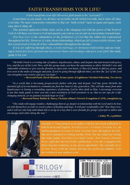 FAITH TRANSFORMS YOUR LIFE! Faith transforms your life! However, faith needs to be "activated"! Somewhere in our minds, we all have an invisible on/off switch for faith, but it turns off after a set time. We must consciously remember to flip our "faith switch" back on again and again, each time after it shuts off. This practical application Bible study can be a life-changing tool with the power of the Word of God. It will draw you closer to God and quench your soul as you set sail on your journey towards hope. Non-Stop Love is the culmination of the faithfulness of God that the author has experienced throughout her life. However, it's also about relationships, which are full of unavoidable drama, and her transformation from all of her vulnerabilities throughout the decades. If you are suffering through abuse, a rocky marriage, or strenuous relationships and are wanting to break free from spiritual and emotional chains and bondages and grow your faith, this study guide is for you. "Michelle's book is a riveting tale of sadness, hopelessness, abuse, and despair, but intertwined with grace, love, and the joy of the Lord. Now, with this group study, you have the opportunity to allow Michelle's raw and vulnerable testimony to give you the freedom to open your own heart, or that of a friend, to find joy, peace, and love even in the midst of struggle and pain. If you're going through difficult times, see how the 'joy' of the Lord can strengthen your resolve and give you hope." -Reverend Pastor David Mazzella, former pastor of Lighthouse Christian Fellowship, New Jersey "In a world that is becoming progressively darker with fear and despair, God has given Michelle the anointed gift of reconciliation to communicate from her heart to this generation. This will take many from utter hopelessness to having a rewarding experience of pleasing God by their faith in Him. I encourage everyone to use this study guide to steer you into a new revelation of God's promises to us, that we are ripe for a life-changing miracle, as we journey towards hope in God." -Reverend Pastor Robbie K. Henry, Christian Alliance Network Evangelism (CANE), caneglobal.org "This study will engage readers, challenging them to go deeper in relationship with the Lord and to be honest with themselves in order to reach a place of healing and hope. It will pair wonderfully with 'Non-Stop Love,' and it will not only help individuals but is set up in a way that is user-friendly for groups of people to utilize and encourage each other along the way." -Ashley W., a publisher