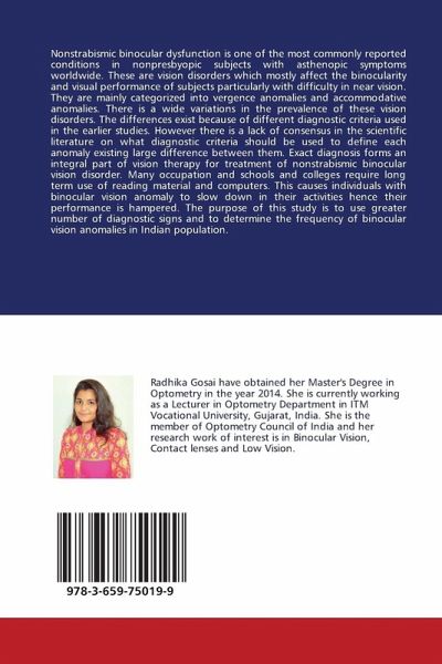 Nonstrabismic binocular dysfunction is one of the most commonly reported conditions in nonpresbyopic subjects with asthenopic symptoms worldwide. These are vision disorders which mostly affect the binocularity and visual performance of subjects particularly with difficulty in near vision. They are mainly categorized into vergence anomalies and accommodative anomalies. There is a wide variations in the prevalence of these vision disorders. The differences exist because of different diagnostic criteria used in the earlier studies. However there is a lack of consensus in the scientific literature on what diagnostic criteria should be used to define each anomaly existing large difference between them. Exact diagnosis forms an integral part of vision therapy for treatment of nonstrabismic binocular vision disorder. Many occupation and schools and colleges require long term use of reading material and computers. This causes individuals with binocular vision anomaly to slow down in their activities hence their performance is hampered. The purpose of this study is to use greater number of diagnostic signs and to determine the frequency of binocular vision anomalies in Indian population.