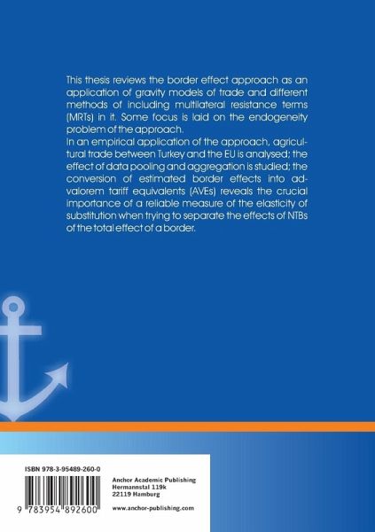 This thesis reviews the border effect approach as an application of gravity models of trade and different methods of including multilateral resistance terms (MRTs) in it. Some focus is laid on the endogeneity problem of the approach. In an empirical application of the approach, agricultural trade between Turkey and the EU is analysed; the effect of data pooling and aggregation is studied; the conversion of estimated border effects into ad-valorem tariff equivalents (AVEs) reveals the crucial importance of a reliable measure of the elasticity of substitution when trying to separate the effects of NTBs of the total effect of a border.