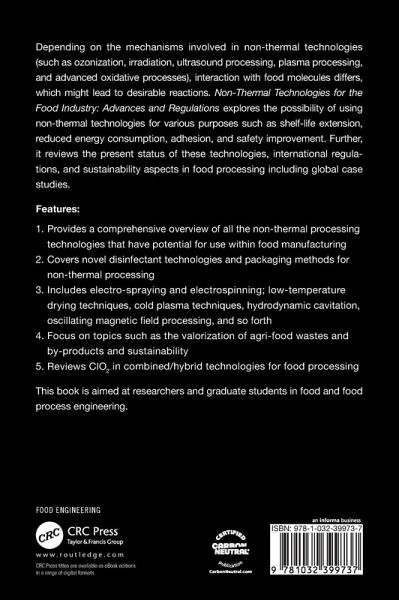 Depending on the mechanisms involved in non-thermal technologies (such as ozonization, irradiation, ultrasound processing, plasma processing, and advanced oxidative processes), interaction with food molecules differs, which might lead to desirable reactions. Non-Thermal Technologies for the Food Industry: Advances and Regulations explores the possibility of using non-thermal technologies for various purposes such as shelf-life extension, reduced energy consumption, adhesion, and safety improvement. Further, it reviews the present status of these technologies, international regulations, and sustainability aspects in food processing including global case studies.