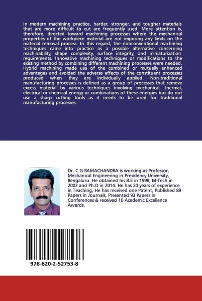 In modern machining practice, harder, stronger, and tougher materials that are more difficult to cut are frequently used. More attention is, therefore, directed toward machining processes where the mechanical properties of the workpiece material are not imposing any limits on the material removal process. In this regard, the nonconventional machining techniques came into practice as a possible alternative concerning machinability, shape complexity, surface integrity, and miniaturization requirements. Innovative machining techniques or modifications to the existing method by combining different machining processes were needed. Hybrid machining made use of the combined or mutually enhanced advantages and avoided the adverse effects of the constituent processes produced when they are individually applied. Non-traditional manufacturing processes is defined as a group of processes that remove excess material by various techniques involving mechanical, thermal, electrical or chemical energy or combinations of these energies but do not use a sharp cutting tools as it needs to be used for traditional manufacturing processes.