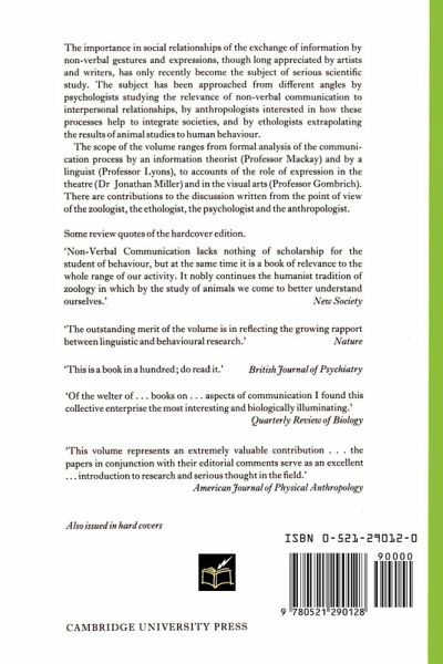 The importance in social relationships of the exchange of information by non-verbal gestures and expressions, though long appreciated by artists and writers, has only recently become the subject of serious scientific study. The subject has been approached from different angles by psychologists studying the relevance of non-verbal communication to interpersonal relationships, by anthropologists interested in how these processes help to integrate societies, and by ethologists extrapolating the results of animal studies to human behaviour. The scope of the volume ranges from formal analysis of the communication process by an information theorist (Professor Mackay) and by a linguist (Professor Lyons), to accounts of the role of expression in the theatre (Dr Jonathan Miller) and in the visual arts (Professor Gombrich). There are contributions to the discussion written from the point of view of the zoologist, the ethologist, the psychologist and the anthropologist.