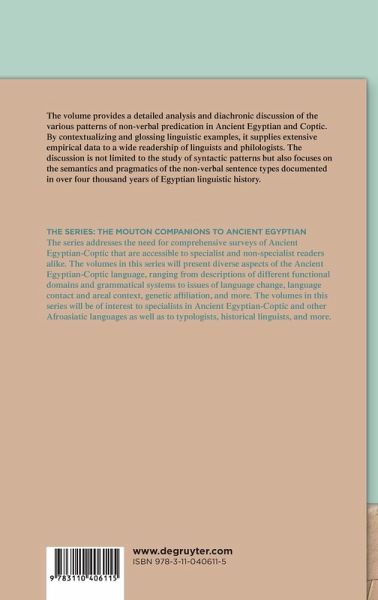 This volume offers now a detailed analysis and a diachronic discussion of the non-verbal patterns of the Egyptian language, from the Pyramid Texts (Earlier Egyptian) to Coptic (Later Egyptian), based on an extensive use of data, especially for later phases. By providing a narrative contextualisation and a linguistic glossing of all examples, it addresses the needs not only of students of Egyptian and Coptic, but also of a linguistic readership. After an introduction into the basic typological features of Egyptian, the main book chapters address morphology, syntax, semantics and pragmatics of the three non-verbal sentence types documented throughout the history of this language: the adverbial sentence, the nominal sentence and the adjectival sentence. These patterns also appear in a variety of clausal environments and can be embedded in verbal constructions.