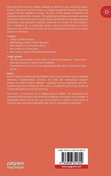 This book is a translation of the original German 1st edition Nicht-Besucherforschung by Martin Tröndle,published by Springer Fachmedien Wiesbaden GmbH, part of Springer Nature in 2019. The translation was done with the help of artificial intelligence (machine translation by the service DeepL.com). A subsequent human revision was done primarily in terms of content, so that the book will read stylistically differently from a conventional translation. Springer Nature works continuously to further the development of tools for the production of books and on the related technologies to support the authors.