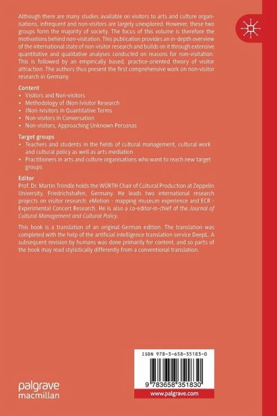 This book is a translation of the original German 1st edition Nicht-Besucherforschung by Martin Tröndle,published by Springer Fachmedien Wiesbaden GmbH, part of Springer Nature in 2019. The translation was done with the help of artificial intelligence (machine translation by the service DeepL.com). A subsequent human revision was done primarily in terms of content, so that the book will read stylistically differently from a conventional translation. Springer Nature works continuously to further the development of tools for the production of books and on the related technologies to support the authors.