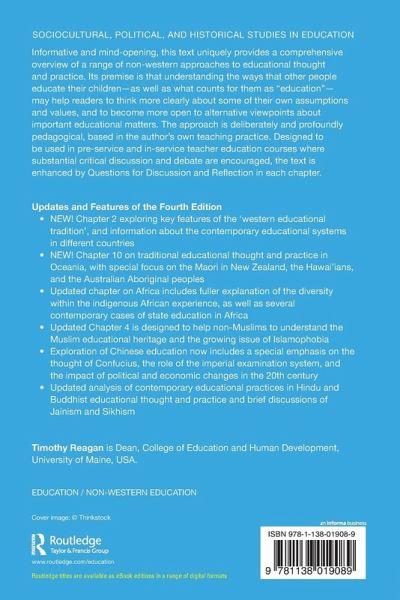 Informative and mind-opening, this text uniquely provides a comprehensive overview of a range of non-western approaches to educational thought and practice. Its premise is that understanding the ways that other people educate their children-as well as what counts for them as "education"-may help readers to think more clearly about some of their own assumptions and values, and to become more open to alternative viewpoints about important educational matters. The approach is deliberately and profoundly pedagogical, based in the author's own teaching practice. Designed to be used in pre-service and in-service teacher education courses where substantial critical discussion and debate are encouraged, the text is enhanced by Questions for Discussion and Reflection in each chapter. Updates and Features of the Fourth Edition ¿ NEW! Chapter 2 exploring key features of the 'western educational tradition', and information about the contemporary educational systems in different countries ¿ NEW! Chapter 10 on traditional educational thought and practice in Oceania, with special focus on the Maori in New Zealand, the Hawai'ians, and the Australian Aboriginal peoples ¿ Updated chapter on Africa includes fuller explanation of the diversity within the indigenous African experience, as well as several contemporary cases of state education in Africa ¿ Updated Chapter 4 is designed to help non-Muslims to understand the Muslim educational heritage and the growing issue of Islamophobia ¿ Exploration of Chinese education now includes a special emphasis on the thought of Confucius, the role of the imperial examination system, and the impact of political and economic changes in the 20th century ¿ Updated analysis of contemporary educational practices in Hindu and Buddhist educational thought and practice and brief discussions of Jainism and Sikhism
