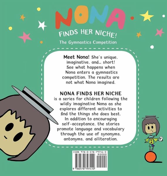 Meet Nona! She's unique, imaginative, and... short! See what happens when Nona enters a gymnastics competition. The results are not what Nona imagined. NONA FINDS HER NICHE is a series for children following the wildly imaginative Nona as she explores different activities to find the things she does best. In addition to encouraging self-acceptance, the stories promote language and vocabulary through the use of synonyms, antonyms, and alliteration.