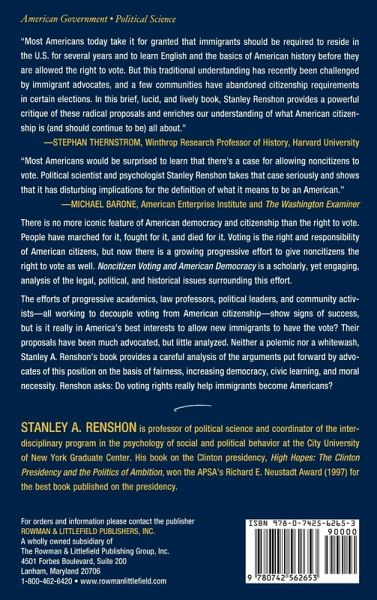 Most Americans today take it for granted that immigrants should be required to reside in the U.S. for several years and to learn English and the basics of American history before they are allowed the right to vote. But this traditional understanding has recently been challenged by immigrant advocates, and a few communities have abandoned citizenship requirements in certain elections. In this brief, lucid, and lively book, Stanley Renshon provides a powerful critique of these radical proposals, and enriches our understanding of what American citizenship is (and should continue to be) all about. -- Stephan Thernstrom, Harvard University Most Americans would be surprised to learn that there's a case for allowing non-citizens to vote. Political scientist and psychologist Stanley Renshon takes that case seriously and shows that it has disturbing implications for the definition of what it means to be an American. -- Michael Barone, American Enterprise Institute and The Washington Examiner