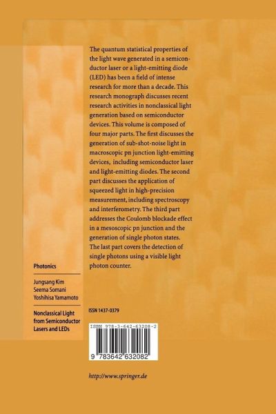 1. Nonclassical Light.- 1.1 Classical Description of Light.- 1.2 Quantum Description of Light.- 1.3 Coherent State, Squeezed State and Number-Phase Squeezed State.- 1.4 Quantum Theory of Photodetection and Sub-Poisson Photon Distribution.- 1.5 Quantum Theory of Second-Order Coherence and Photon Antibunching.- 1.6 Quantum Theory of Photocurrent Fluctuation and Squeezing.- 2. Noise of p-n Junction Light Emitters.- 2.1 Introduction.- 2.2 Junction Voltage Dynamics: the Poisson Equation.- 2.3 Semiclassical Langevin Equation for Junction Voltage Dynamics.- 2.4 Noise Analysis of an LED.- 2.5 Summary.- 3. Sub-Poissonian Light Generation in Light-Emitting Diodes.- 3.1 Introduction.- 3.2 Physical Mechanism of Pump-Noise Suppression.- 3.3 Measurement of the Squeezing Bandwidth.- 3.4 Summary.- 4. Amplitude-Squeezed Light Generation in Semiconductor Lasers.- 4.1 Introduction.- 4.2 Interferometric Measurement of Longitudinal-Mode-Partition Noise.- 4.3 Grating-Feedback External-Cavity Semiconductor Laser.- 4.4 Injection-Locked Semiconductor Laser.- 4.5 Summary.- 5. Excess Intensity Noise of a Semiconductor Laser with Nonlinear Gain and Loss.- 5.1 Introduction.- 5.2 Physical Models for Nonlinearity.- 5.3 Noise Analysis Using Langevin Rate Equations.- 5.4 Numerical Results.- 5.5 Discussion: Effect of Saturable Loss.- 5.6 Comparison of Two Laser Structures with Respect to Saturable Loss.- 5.7 Summary.- 6. Transverse-Junction-Stripe Lasers for Squeezed Light Generation.- 6.1 Introduction.- 6.2 Fabrication.- 6.3 DC Characterization: Threshold, Loss and Quantum Efficiency.- 6.4 Intensity Noise.- 6.5 Summary.- 7. Sub-Shot-Noise FM Spectroscopy.- 7.1 Introduction.- 7.2 Advantages of Semiconductor Lasers.- 7.3 Signal-to-Noise Ratio (SNR).- 7.4 Realization of Sub-Shot-Noise FM Spectroscopy.- 7.5 Experimental Results.- 7.6 Future Prospects.- 8. Sub-Shot-Noise FM Noise Spectroscopy.- 8.1 Introduction.- 8.2 Principle of FM Noise Spectroscopy.- 8.3 Signal-to-Noise Ratio and the Advantage of Amplitude Squeezing.- 8.4 Sub-Shot-Noise Spectroscopy.- 8.5 Phase-Sensitive FM Noise Spectroscopy.- 8.6 Summary.- 9. Sub-Shot-Noise Interferometry.- 9.1 Introduction.- 9.2 Sensitivity Limit of an Optical Interferometer.- 9.3 Amplitude-Squeezed Light Injection in a Dual-Input Mach-Zehnder Interferometer.- 9.4 Sub-Shot-Noise Phase Measurement.- 9.5 Dual-Input Michelson Interferometer.- 9.6 Summary and Future Prospects.- 10. Coulomb Blockade Effect in Mesoscopic p-n Junctions.- 10.1 Introduction.- 10.2 Calculation of Resonant Tunneling Rates.- 10.3 Coulomb Blockade Effect on Resonant Tunneling.- 10.4 Coulomb Staircase.- 10.5 Turnstile Operation.- 10.6 Monte-Carlo Simulations.- 10.7 Summary.- 11. Single-Photon Generation in a Single-Photon Turnstile Device.- 11.1 Introduction.- 11.2 Device Fabrication.- 11.3 Observation of the Coulomb Staircase.- 11.4 Single-Photon Turnstile Device.- 11.5 Summary.- 12. Single-Photon Detection with Visible-Light Photon Counter.- 12.1 Introduction.- 12.2 Comparison of Single-Photon Detectors.- 12.3 Operation Principle of a VLPC.- 12.4 Single-Photon Detection System Based on a VLPC.- 12.5 Quantum Efficiency of a VLPC.- 12.6 Theory of Noise in Avalanche Multiplication.- 12.7 Excess Noise Factor of a VLPC.- 12.8 Two-Photon Detection with a VLPC.- 12.9 Summary.- 13. Future Prospects.- 13.1 Introduction.- 13.2 Regulated and Entangled Photons from a Single Quantum Dot.- 13.3 Single-Mode Spontaneous Emission from a Single Quantum Dot in a Three-Dimensional Microcavity.- 13.4 Lasing and Squeezing of Exciton-Polaritons in a Semiconductor Microcavity.- A. Appendix: Noise and Correlation Spectra for Light-Emitting Diode.- A.1 Linearization.- A.2 LED Photon Noise Spectral Density.- A.3 External Current Noise Spectral Density.- A.4 Junction-Voltage-Carrier-Number Correlation.- A.5 Photon-Flux -Junction-Voltage Correlation.- References.