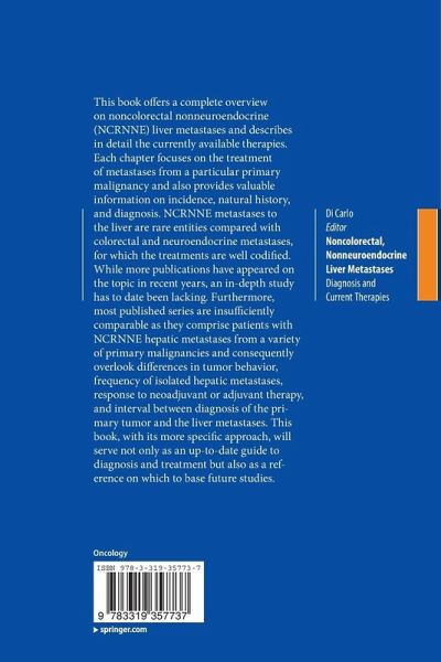 This book offers a complete overview on non colorectal non neuroendocrine (NCRNNE) liver metastases and describes in detail the currently available therapies. Each chapter focuses on the treatment of metastases from a particular primary malignancy and also provides valuable information on incidence, natural history and diagnosis. NCRNNE liver metastases are rare entities compared with colorectal and neuroendocrine metastases, for which the treatments are well codified. While more publications have appeared on the topic in recent years, an in-depth study has to date been lacking. Furthermore, most published series are insufficiently comparable as they comprise patients with NCRNNE hepatic metastases from a variety of primary malignancies and consequently overlook differences in tumor behavior, frequency of isolated hepatic metastases, response to neoadjuvant or adjuvant therapy and interval between diagnosis of the primary tumor and the liver metastases. This book, with its more specific approach, will serve not only as an up-to-date guide to diagnosis and treatment but also as a reference on which to base future studies.