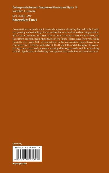 Computational methods, and in particular quantum chemistry, have taken the lead in our growing understanding of noncovalent forces, as well as in their categorization. This volume describes the current state of the art in terms of what we now know, and the current questions requiring answers in the future. Topics range from very strong (ionic) to very weak (CH--pi) interactions. In the intermediate regime, forces to be considered are H-bonds, particularly CH--O and OH--metal, halogen, chalcogen, pnicogen and tetrel bonds, aromatic stacking, dihydrogen bonds, and those involving radicals. Applications include drug development and predictions of crystal structure.