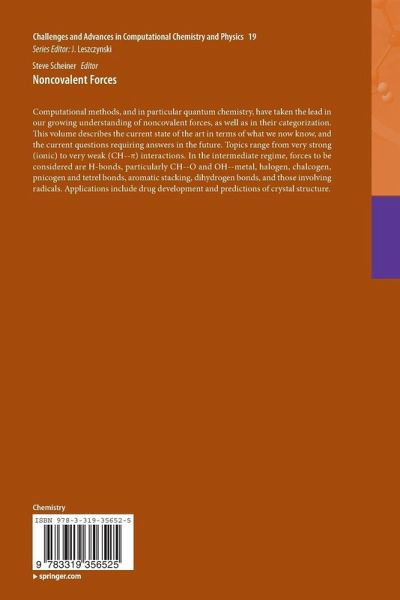 Computational methods, and in particular quantum chemistry, have taken the lead in our growing understanding of noncovalent forces, as well as in their categorization. This volume describes the current state of the art in terms of what we now know, and the current questions requiring answers in the future. Topics range from very strong (ionic) to very weak (CH--pi) interactions. In the intermediate regime, forces to be considered are H-bonds, particularly CH--O and OH--metal, halogen, chalcogen, pnicogen and tetrel bonds, aromatic stacking, dihydrogen bonds, and those involving radicals. Applications include drug development and predictions of crystal structure.
