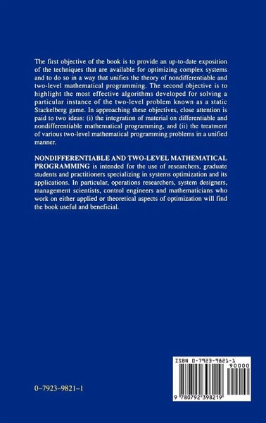 The analysis and design of engineering and industrial systems has come to rely heavily on the use of optimization techniques. The theory developed over the last 40 years, coupled with an increasing number of powerful computational procedures, has made it possible to routinely solve problems arising in such diverse fields as aircraft design, material flow, curve fitting, capital expansion, and oil refining just to name a few. Mathematical programming plays a central role in each of these areas and can be considered the primary tool for systems optimization. Limits have been placed on the types of problems that can be solved, though, by the difficulty of handling functions that are not everywhere differentiable. To deal with real applications, it is often necessary to be able to optimize functions that while continuous are not differentiable in the classical sense. As the title of the book indicates, our chief concern is with (i) nondifferentiable mathematical programs, and (ii) two-level optimization problems. In the first half of the book, we study basic theory for general smooth and nonsmooth functions of many variables. After providing some background, we extend traditional (differentiable) nonlinear programming to the nondifferentiable case. The term used for the resultant problem is nondifferentiable mathematical programming. The major focus is on the derivation of optimality conditions for general nondifferentiable nonlinear programs. We introduce the concept of the generalized gradient and derive Kuhn-Tucker-type optimality conditions for the corresponding formulations.