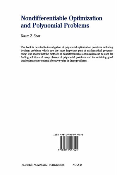 Polynomial extremal problems (PEP) constitute one of the most important subclasses of nonlinear programming models. Their distinctive feature is that an objective function and constraints can be expressed by polynomial functions in one or several variables. Let :e = {:e 1, ... , :en} be the vector in n-dimensional real linear space Rn; n PO(:e), PI (:e), ... , Pm (:e) are polynomial functions in R with real coefficients. In general, a PEP can be formulated in the following form: (0.1) find r = inf Po(:e) subject to constraints (0.2) Pi (:e) =0, i=l, ... ,m (a constraint in the form of inequality can be written in the form of equality by introducing a new variable: for example, P( x) ~ 0 is equivalent to P(:e) + y2 = 0). Boolean and mixed polynomial problems can be written in usual form by adding for each boolean variable z the equality: Z2 - Z = O. Let a = {al, ... ,a } be integer vector with nonnegative entries {a;}f=l. n Denote by R[a](:e) monomial in n variables of the form: nR[a](:e) = IT :ef'; ;=1 d(a) = 2:7=1 ai is the total degree of monomial R[a]. Each polynomial in n variables can be written as sum of monomials with nonzero coefficients: P(:e) = L caR[a](:e), aEA{P) IX x Nondifferentiable optimization and polynomial problems where A(P) is the set of monomials contained in polynomial P.