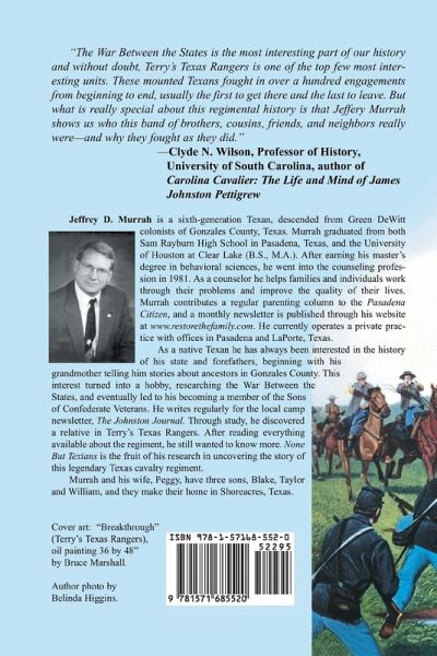None But Texians: presents the accomplishments and struggles of Terry's Texas Rangers as they fought through hundreds of engagements across seven states. This history covers the weapons the Rangers carried, flags they fought under, clothes they wore, songs they sang, and what became of many of them after the war.