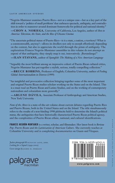 "None of the Above" is a state-of-the-art volume about current debates regarding Puerto Rico and Puerto Ricans, both in the United States and on the Island. The title simultaneously refers to the results of a non-binding 1998 plebiscite held to determine the Island's political status, the ambiguities that have historically characterized Puerto Rican political agency, and the complexities of Puerto Rican ethnic, national, and cultural identifications.
